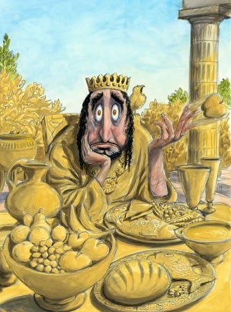 Midas hief zijn handen ten hemel en riep: ”Dionysus heb genade met deze domme, domme man. Vergeef mijn hebzucht en neem mijn wens terug!”