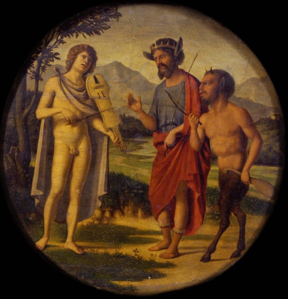 Toen kwam Apollo. Hij speelde op zijn lier. Zo mooi dat bijna alle toehoorders moesten huilen van de prachtige melodieën. De scheidsrechter besloot met toestemming van alle toehoorders dat Apollo de wedstrijd had gewonnen. Maar Midas uitte daarover zijn misnoegen. Hij vond als enige dat Pan had gewonnen. Toen kwam Apollo achter Midas staan en greep hem bij zijn oren. Met een lichte ruk trok Apollo ze een beetje omhoog en de oren werden lang en spits en er groeide grijs haar op. Apollo kon niet aanzien dat zulke domme oren een menselijke vorm zouden hebben en hij gaf Midas een paar ezelsoren. Om zijn schande te bedekken liet hij een speciale muts maken waar zijn ezelsoren volledig onder schuilgingen. De beroemde Frygische muts. En hij verstopte zich in zijn paleis.