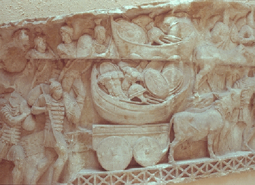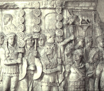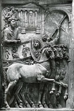 Voor zijn wagen liepen hoornblazers, wagens volgeladen met de veroverde buit en grote groepen krijgsgevangenen. Achter zijn wagen liepen zijn familieleden en soldaten van zijn legioenen.